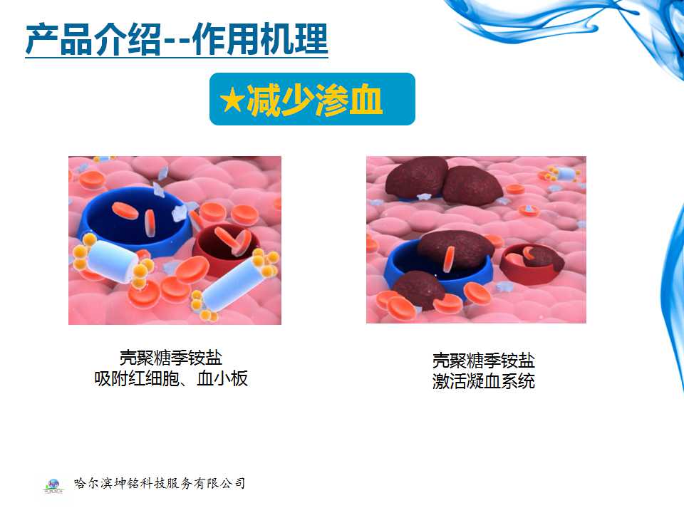 ⑤促进伤口愈合:壳聚糖季铵盐含有大量的亲水性基团,可以为组织提供一个合适的湿性愈合环境,湿性愈合环境有利于毛细血管的生成,进而促进伤口愈合。另外,复可邦还可保护t-PA的活性,进一步促进伤口愈合。